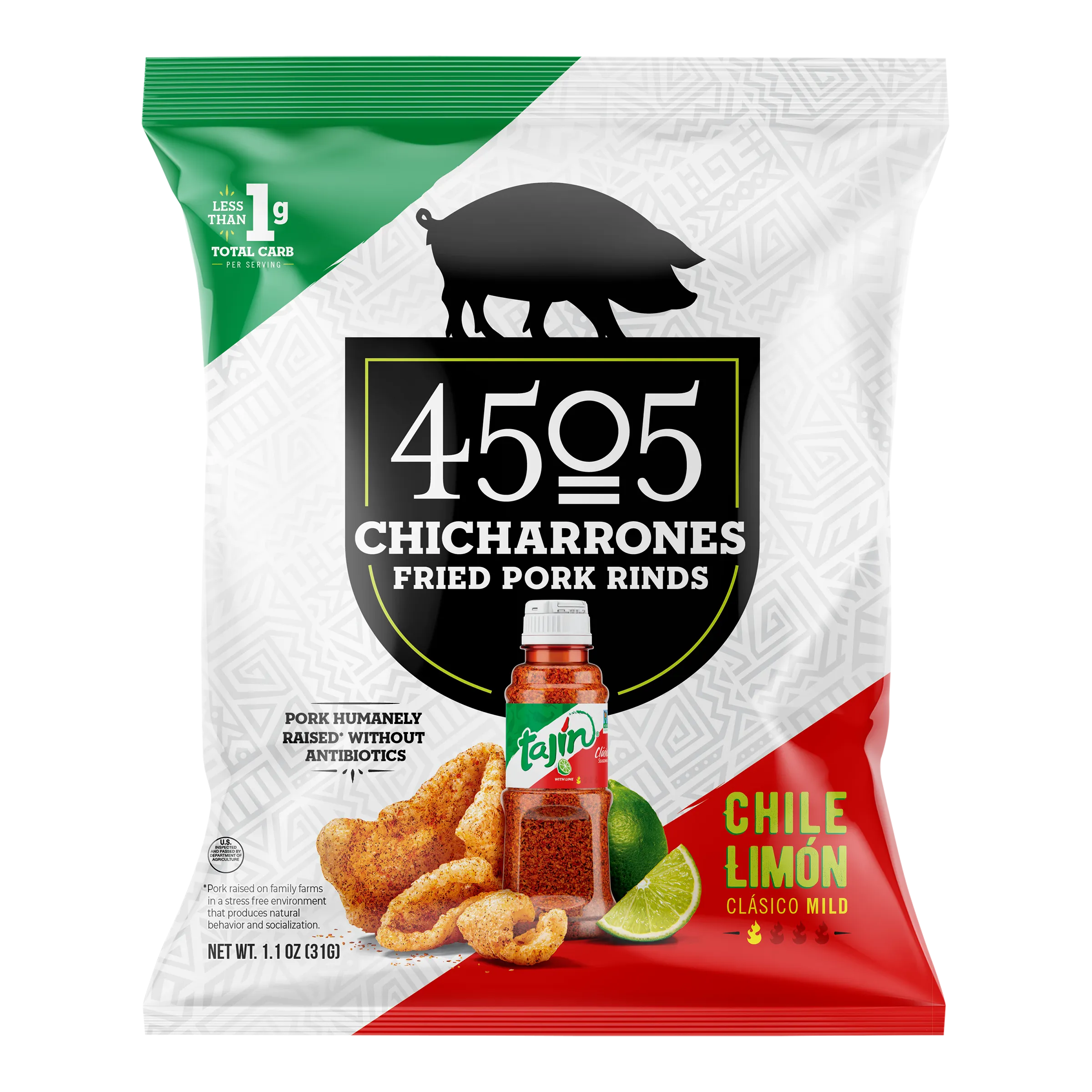 Made in collaboration with our friends at Tajin, we’ve taken our light, crispy 4505 chicharrones and seasoned them with the 100% natural chili peppers, lime, and sea salt goodness of Tajin Clasico.