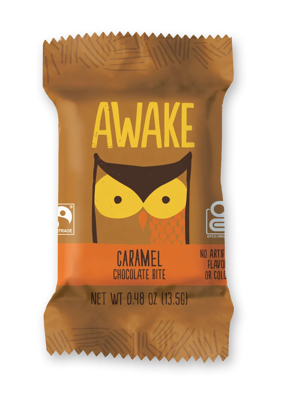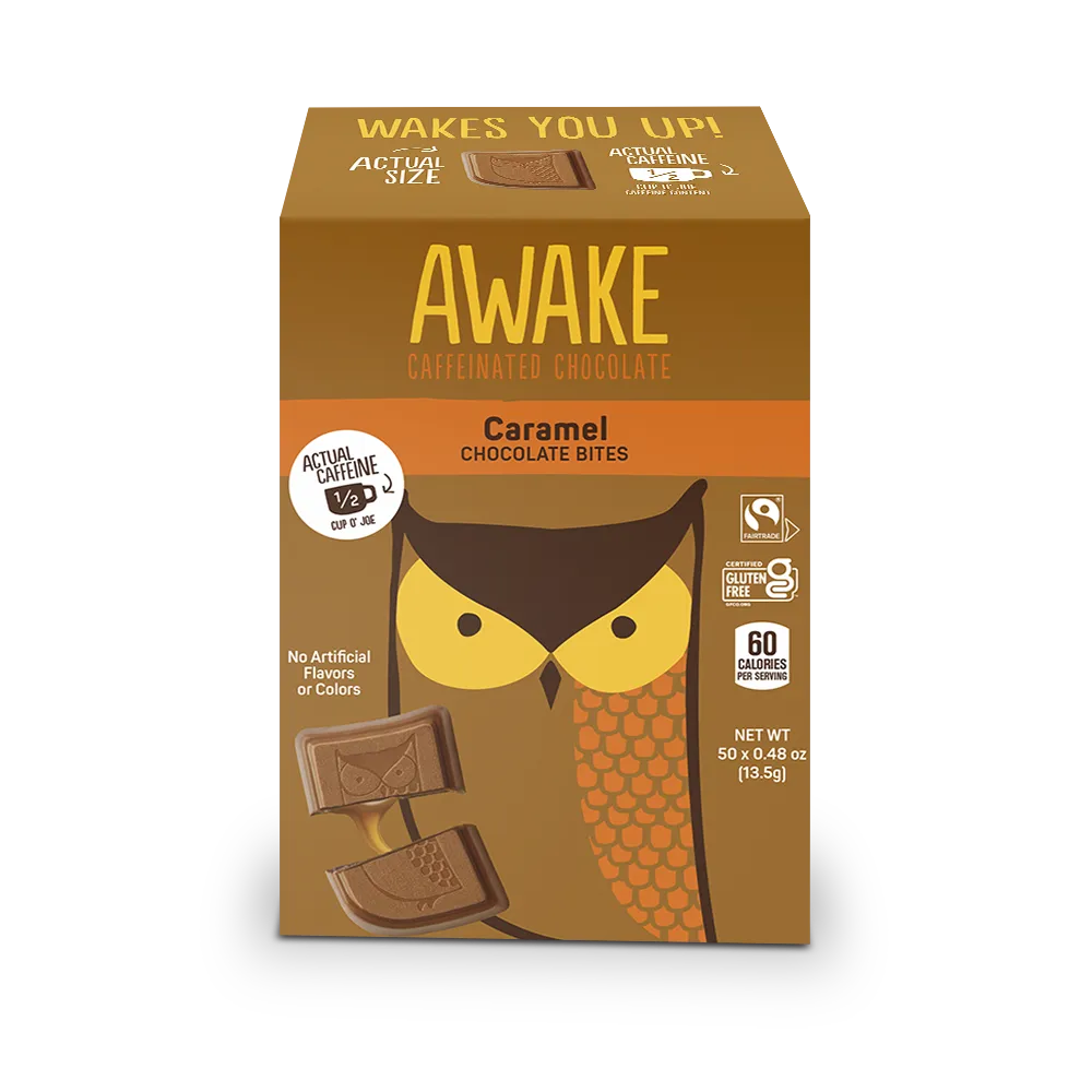 Each delicious AWAKE Chocolate Caramel Milk Chocolate Bite contains a gooey Caramel center and contains 50mg of caffeine (half a cup o’ joe). Perfect for when you gotta get stuff done, but don’t have the energy to do it!