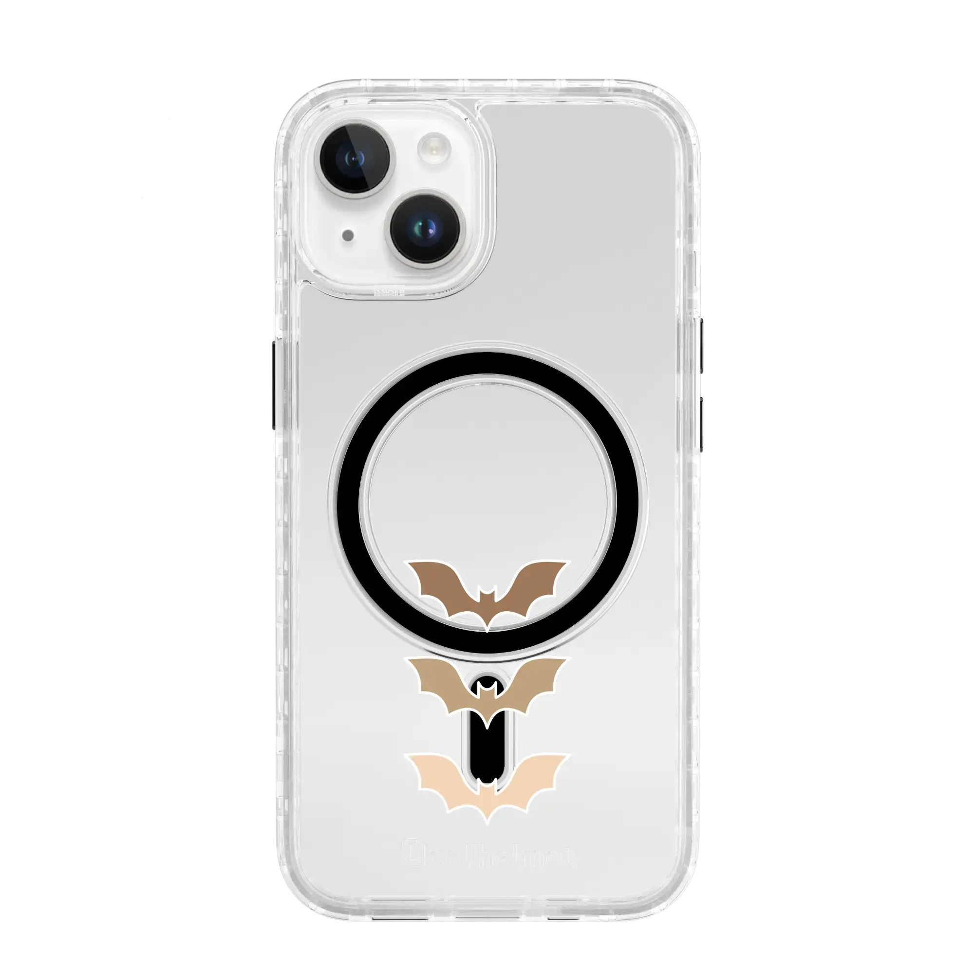 Bat-Inspired phone case from the Halloween Case Series for iPhone 14 Series, in a crystal clear case. MagSafe® compatible, easily attach your favorite accessories. Made from 50% recycled TPU material. It features Cross Diffuse technology for shock absorption. Third-party 13-foot drop-test certified, providing maximum protection. Scratch-resistant, keeping your iPhone 14 pristine. Product lifetime warranty included. Designed for iPhone 14, iPhone 14 Plus, iPhone 14 Pro, and iPhone 14 Pro Max.